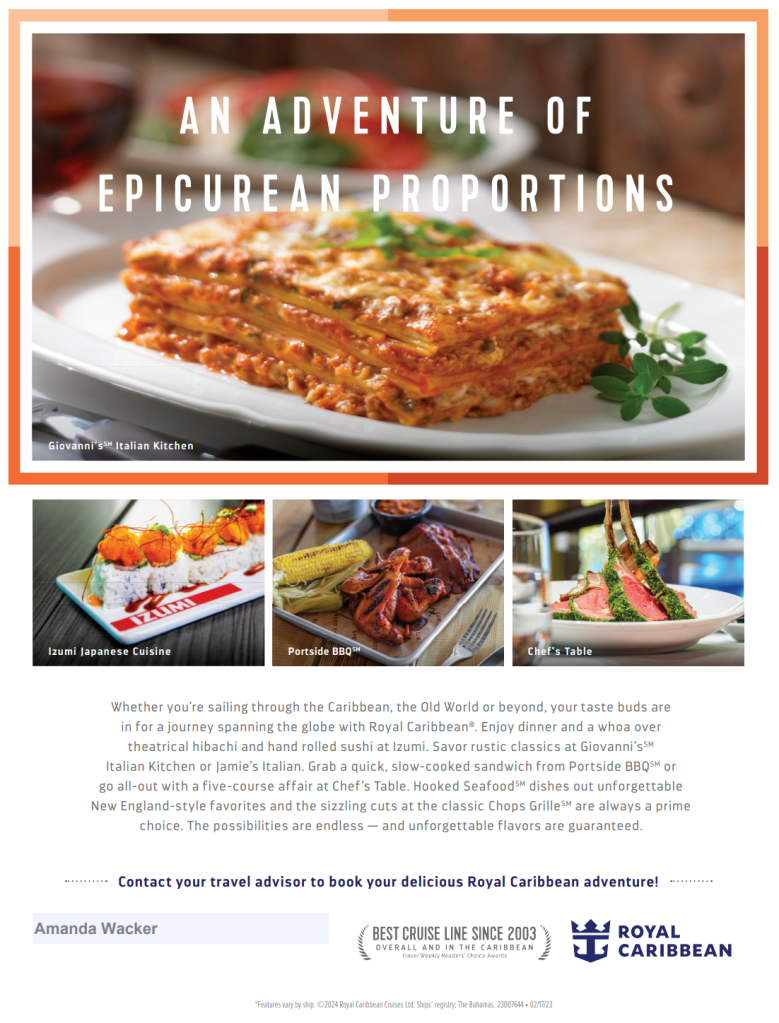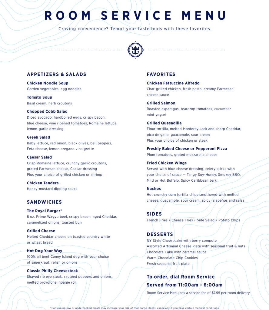 Sometimes the best meals are the ones you don’t have to leave the room for. Royal Caribbean offers 24-hour room service, so whether it’s a family breakfast on the balcony, late-night cookies and milk, or just a quiet dinner in your stateroom, you’re covered. Continental breakfast is complimentary, while a small service fee applies for most other orders—still a great option when you want convenience without compromise.